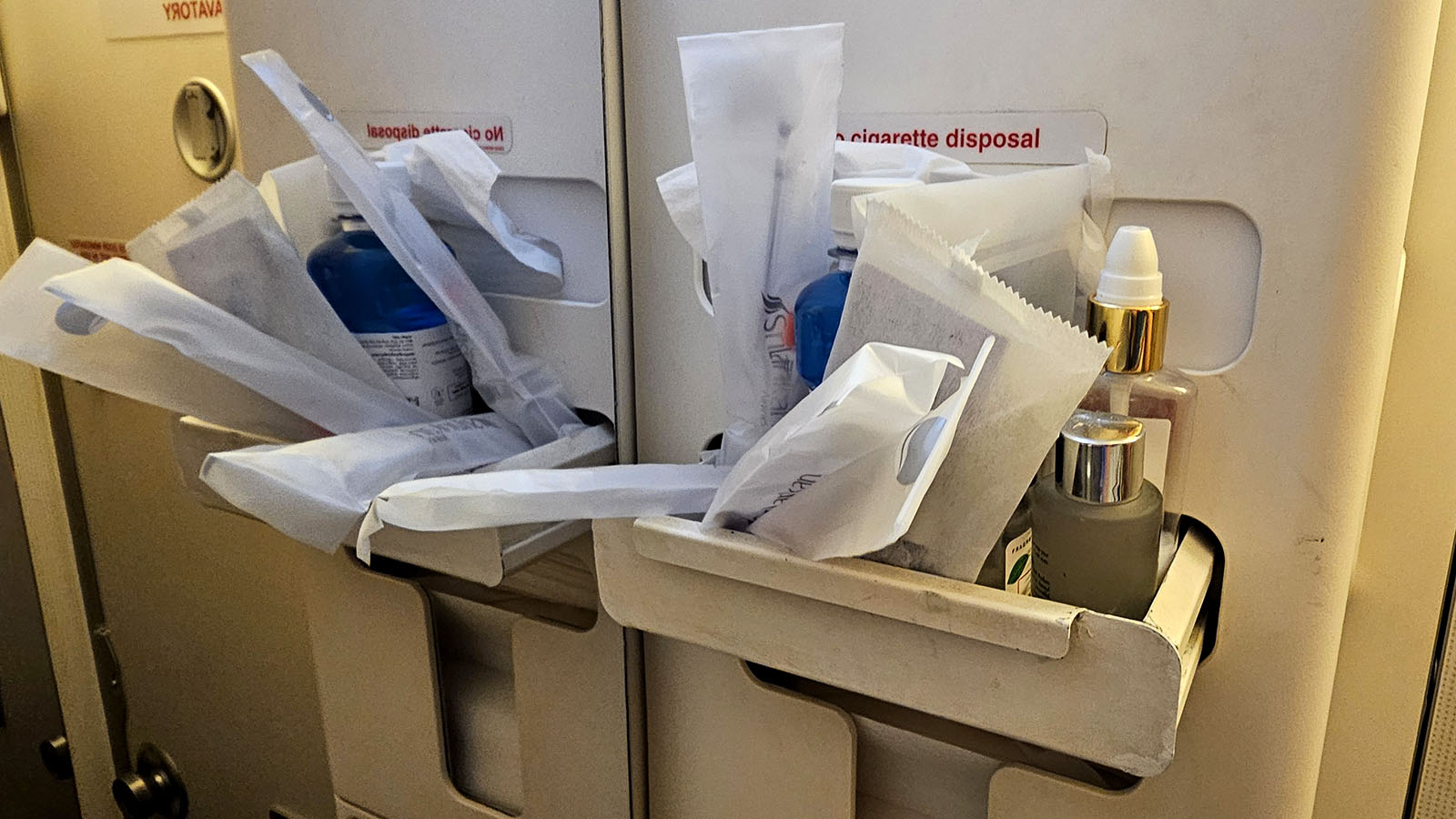 I’m happy with my front row window seat. Being on the right-hand side provides a great view of the sunset. And while there are no amenity kits in SriLankan Airlines’ Airbus A320 Business Class, the lavatory is well-stocked with whatever you might need.