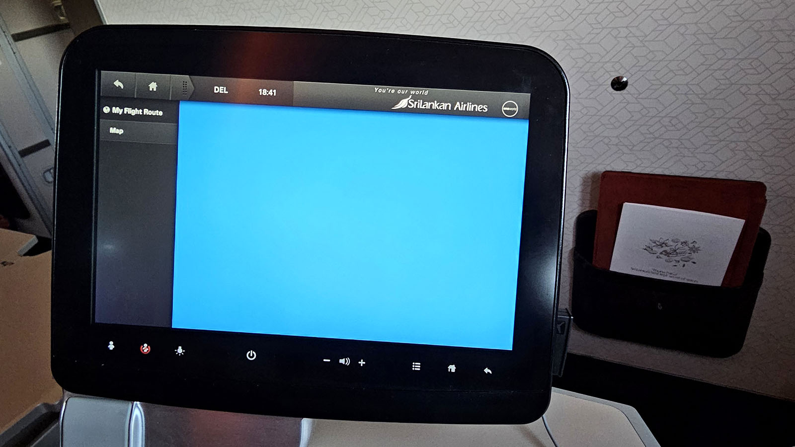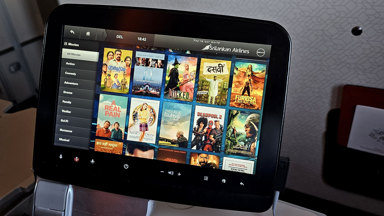 Overall, there isn’t a huge amount of content. But what’s there isn’t bad, with relatively recent titles like Wicked. I save that one for a flight with a bigger and better screen, though. I happen to notice that the map doesn’t work… I can’t tell whether it’s displaying only ocean, or just a blue screen. Either way, to check the progress of the flight, I have to use my own device and connect to the entertainment Wi-Fi network on board.