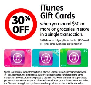 I don’t normally write about general discounts on offers, but as this one is of interest to me, it may be to you too. I usually keep an eye on iTunes offers over at Gift Cards on Sale and they about posted a 30% discount offer at Coles on iTunes vouchers, which is valid (while … Continued