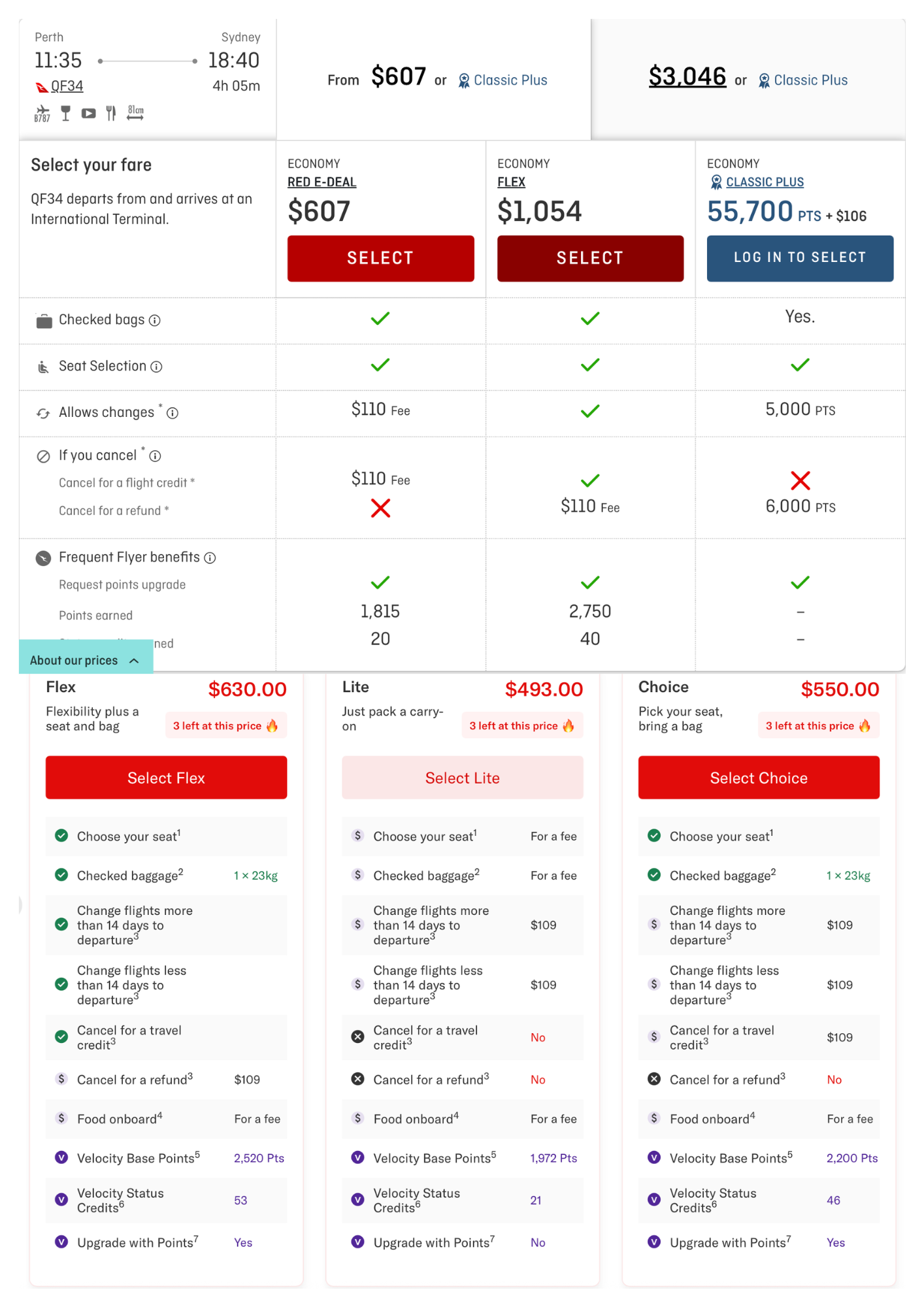 The Red Roo keeps it simple with just three different cash fares on offer — Economy Red e-Deal and Flex, plus Business Class. In addition, Qantas Classic Flight Rewards using points are great value as well.